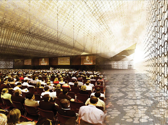 El proyecto se sitúa en un entorno diverso fuertemente construido con edificaciones de caracteres diferentes. El equipamiento se concibe como una construcción unitaria formada por una cubierta singular que alberga el total del programa y soportada por una estructura de sección variable apoyada sobre cuatro pilares principales. La gran sala se sitúa de forma central mientras que en el norte y en el sur se sitúan los accesos y los servicios. Esta disposición permite una mejor accesibilidad y una segregación de circulaciones. Se trata de un gran espacio diáfano de 60x60 m y una altura de entre 5.5m y 8m, y divisible en dos salas